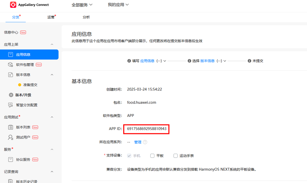 步骤8 发布后,可在应用信息中查看APP ID,此处的APP ID将于第4.5章应用发布中使用。