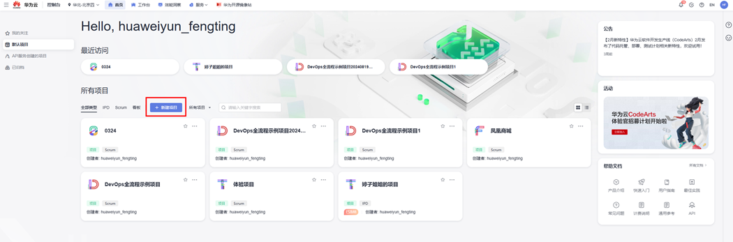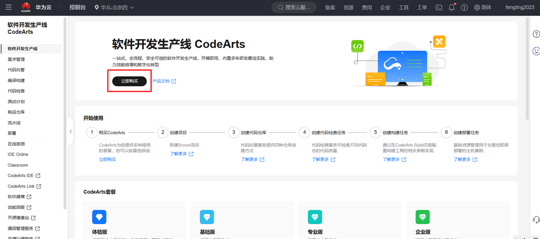 步骤5 套餐开通后,前往CodeArts工作台,也可以直接通过链接访问工作台:https://devcloud.cn-north-4.huaweicloud.cn/home 。