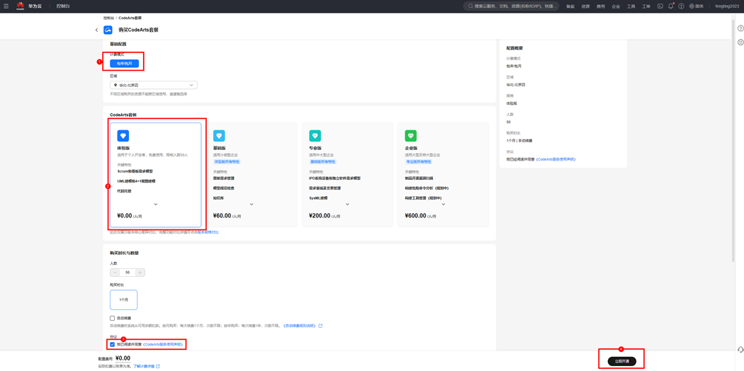 步骤4 进入购买页面,计费模式选择“包年/包月”;区域可根据实际情况选择,默认可选择“华为-北京四”;CodeArts套餐选择“体验版”;购买时长与数量默认为“50人”;购买时长默认为“1个月”;是否自动续费可根据实际情况选择是否勾选(自动续费不会产生任何费用,体验版套餐为永久免费套餐);协议需勾选“我已阅读并同意”。点击“立即开通”。