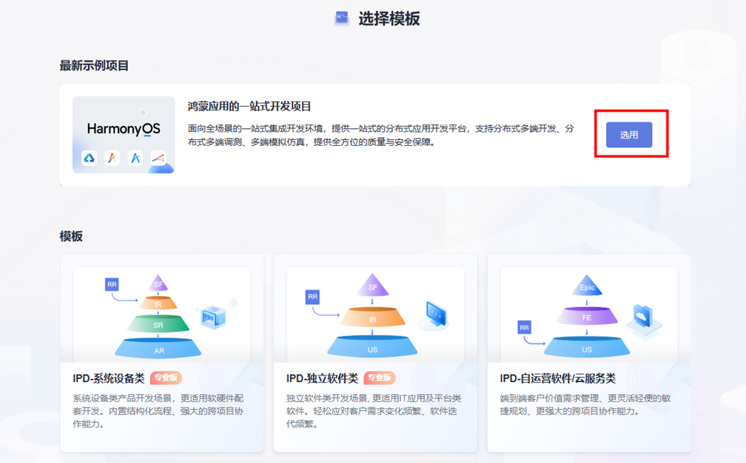 步骤1 若是首次创建项目,直接选用“鸿蒙应用的一站式开发项目” 示例项目;若之前创建过项目,单击“新建项目”,在选择模板中选用“鸿蒙应用的一站式开发项目”示例项目。