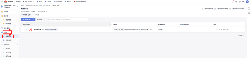 步骤1 点击左侧菜单“代码-代码托管”,即可新建仓库,将代码托管到CodeArts的代码仓中。由于本示例项目已初始化了相关任务,所以我们可以直接看到一个已经创建好的名为“HealthyDiet”的代码仓。