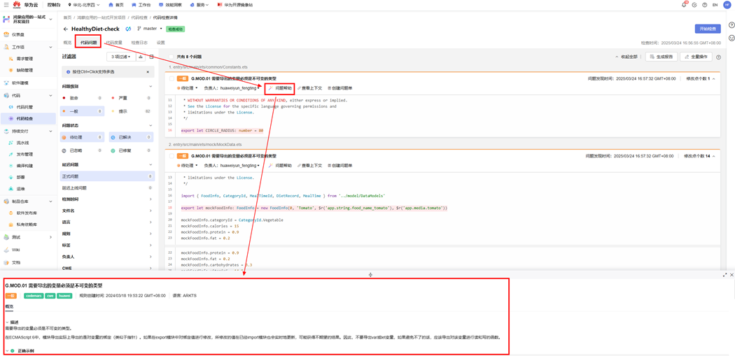 步骤5 点击“代码问题”页签,点击对应问题的“问题帮助”可以查看具体问题和修改建议。