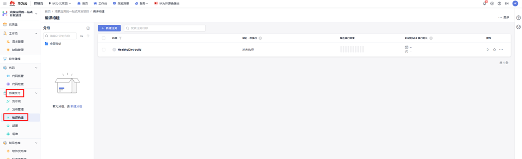 步骤1 点击左侧菜单“持续交付-编译构建”,可以新建构建任务。由于本示例项目已初始化了相关任务,所以我们可以直接看到一个已经创建好的名为“HealthyDiet-build”的构建任务。