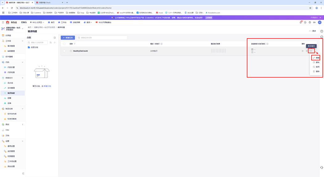 步骤2 点击构建任务操作栏的“更多图标-编辑”。