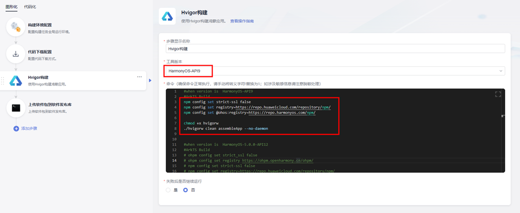 步骤3 点击“Hvigor构建”,工具版本选择“HarmonyOS-API9”;命令中将HarmonyOS-API12版本的命令行用“#“注释掉,将Harmony-API9版本的命令行显示出来。如下图所示: