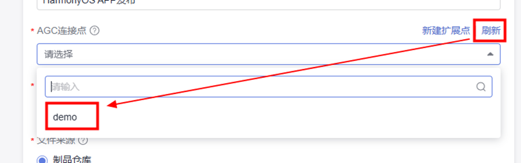 步骤7 在HarmonyOS APP发布弹框中,点击“刷新”,选择刚刚创建好的的连接点名称。