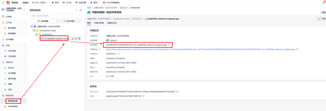 步骤9 输入制品仓文件路径。点击左侧菜单“制品仓库-软件发布库“,点击包文件名称,复制相对路径填入制品仓库文件路径。