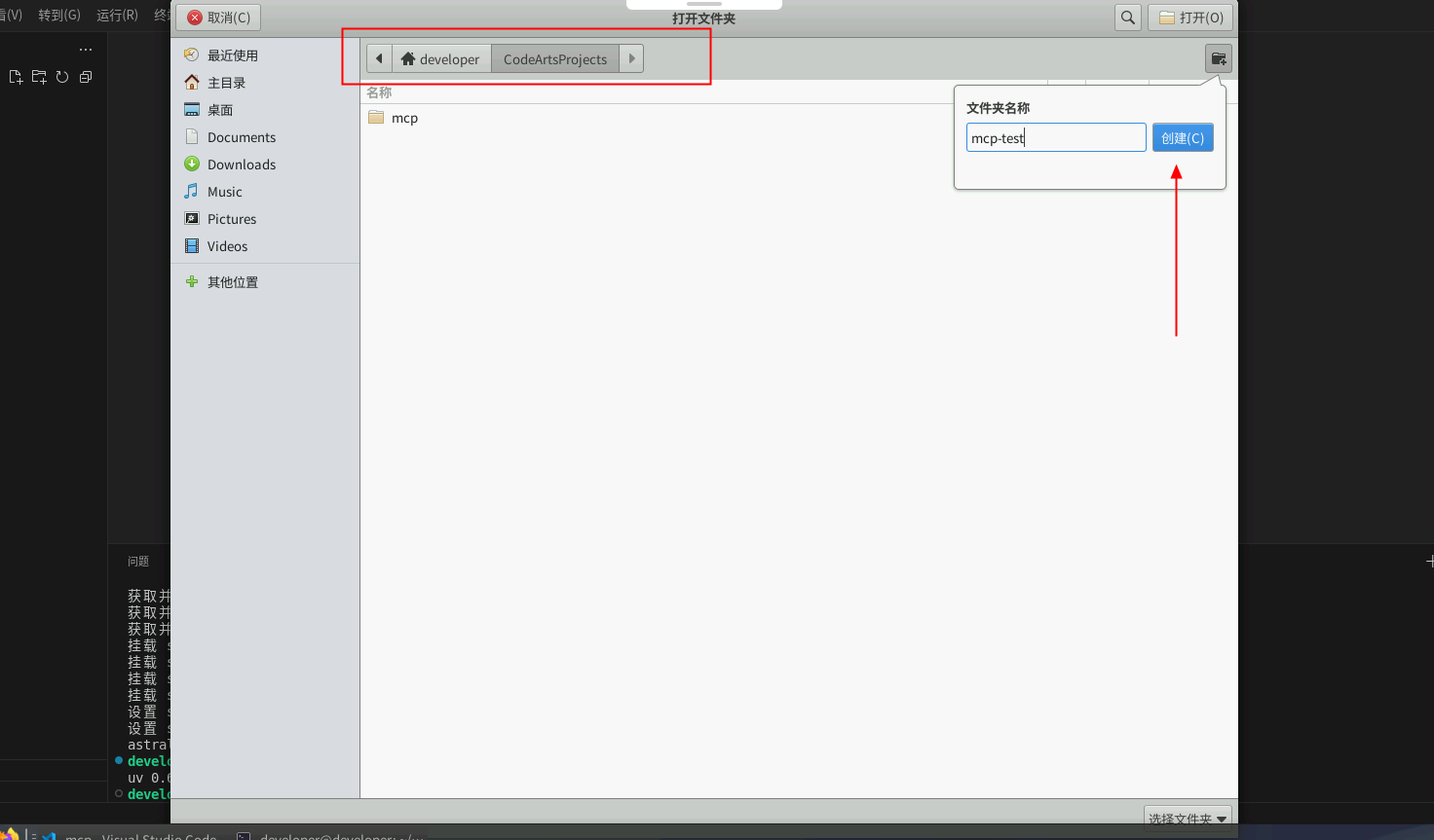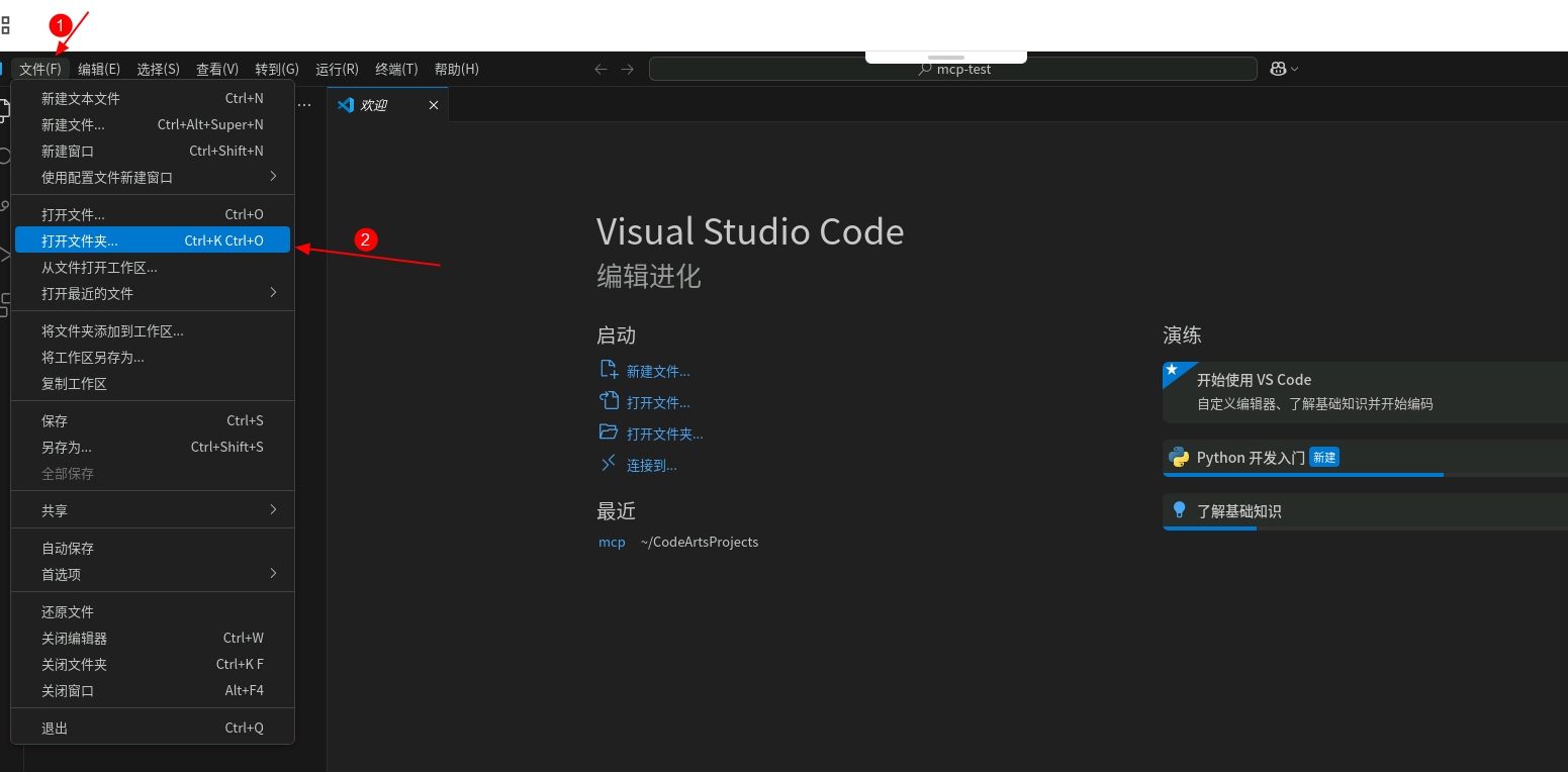 1.在VSCode中,左上角点击文件->打开文件夹,在截图目录下创建文件mcp-test,点击左上角打开。