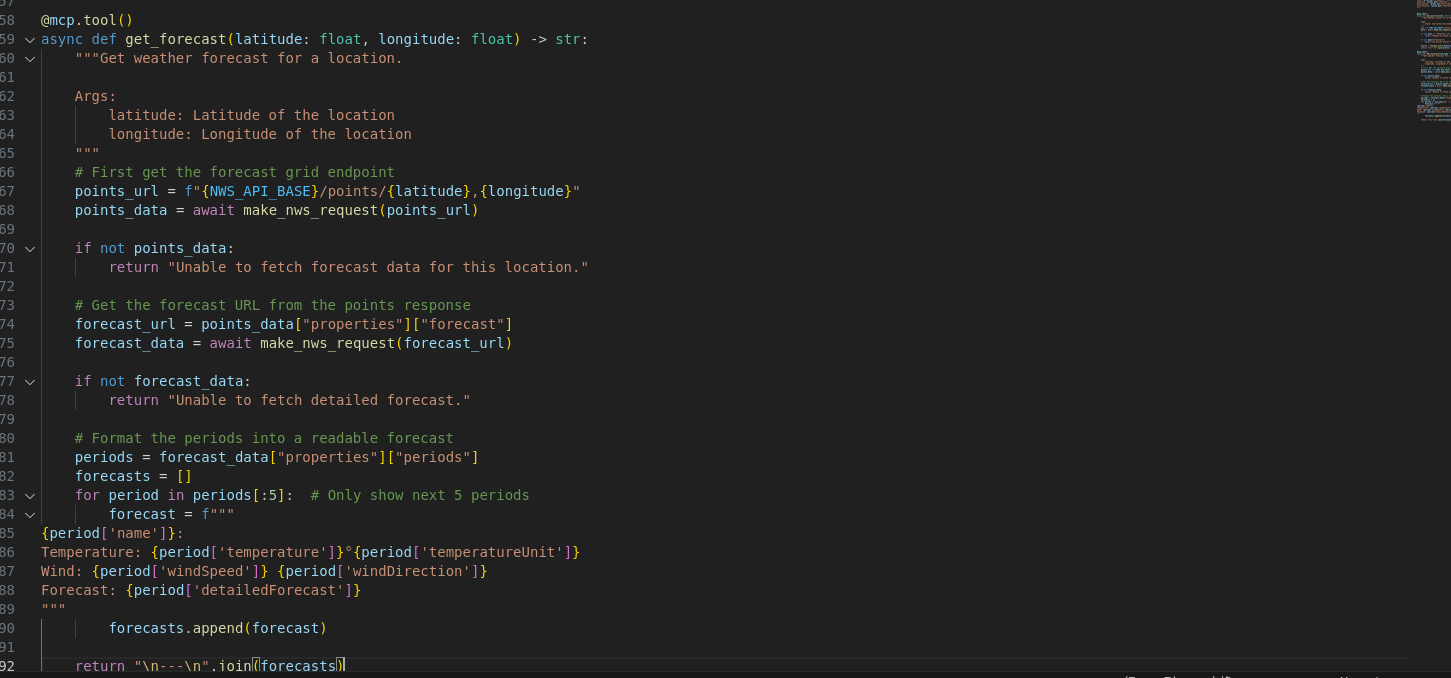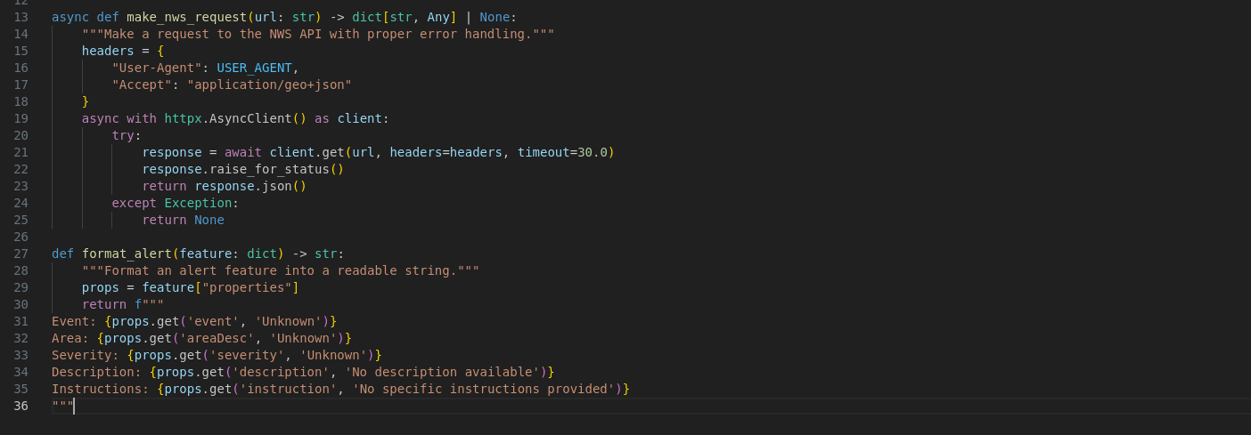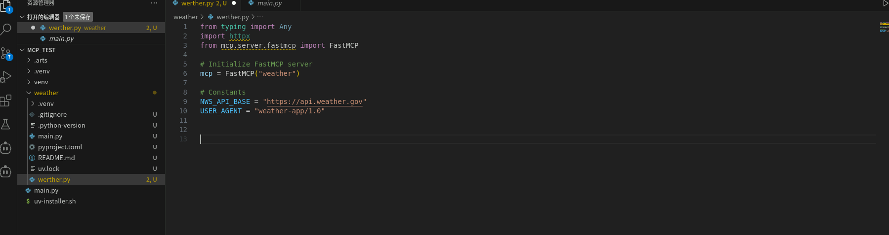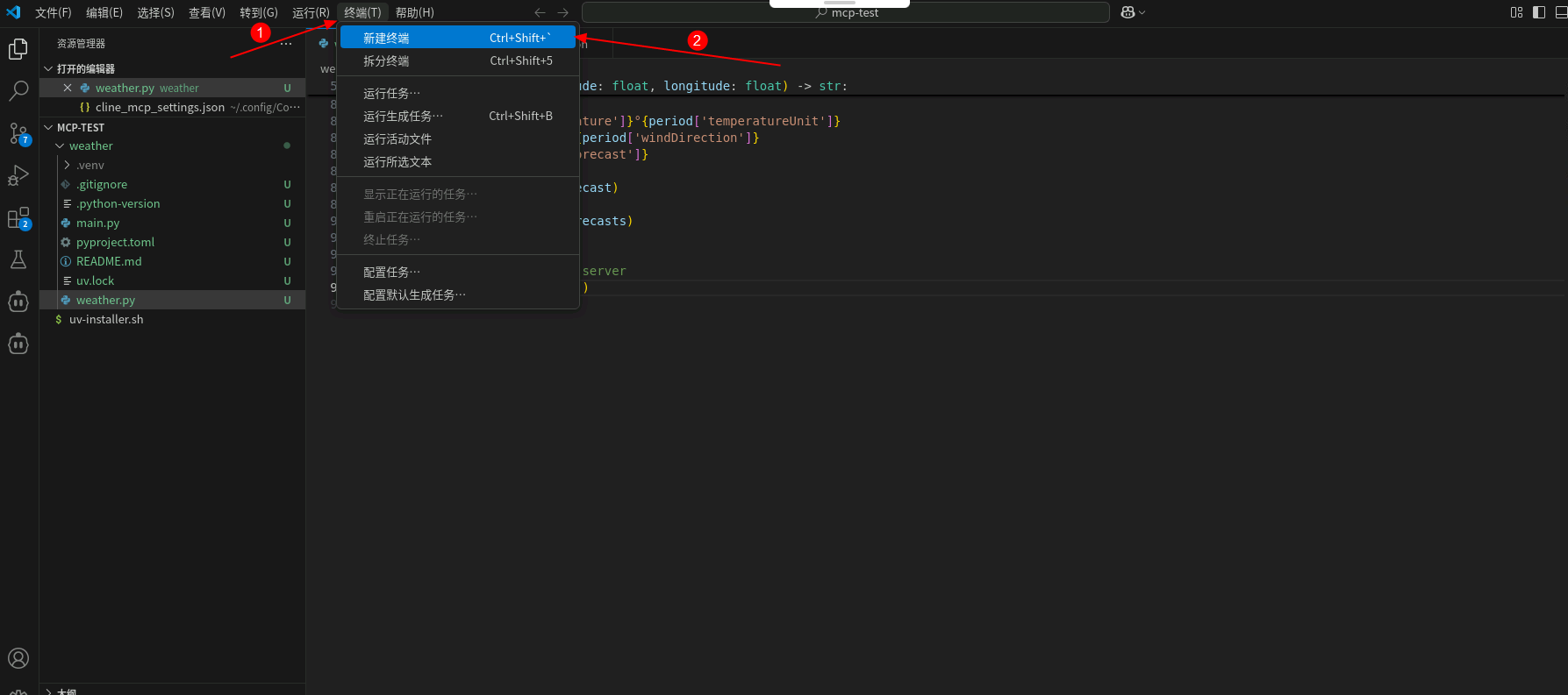 3. 定义MCP Server工具函数get_alerts和get_forecast,工具函数用来执行查询天气情况的逻辑,将以下代码复制到VSCode中。