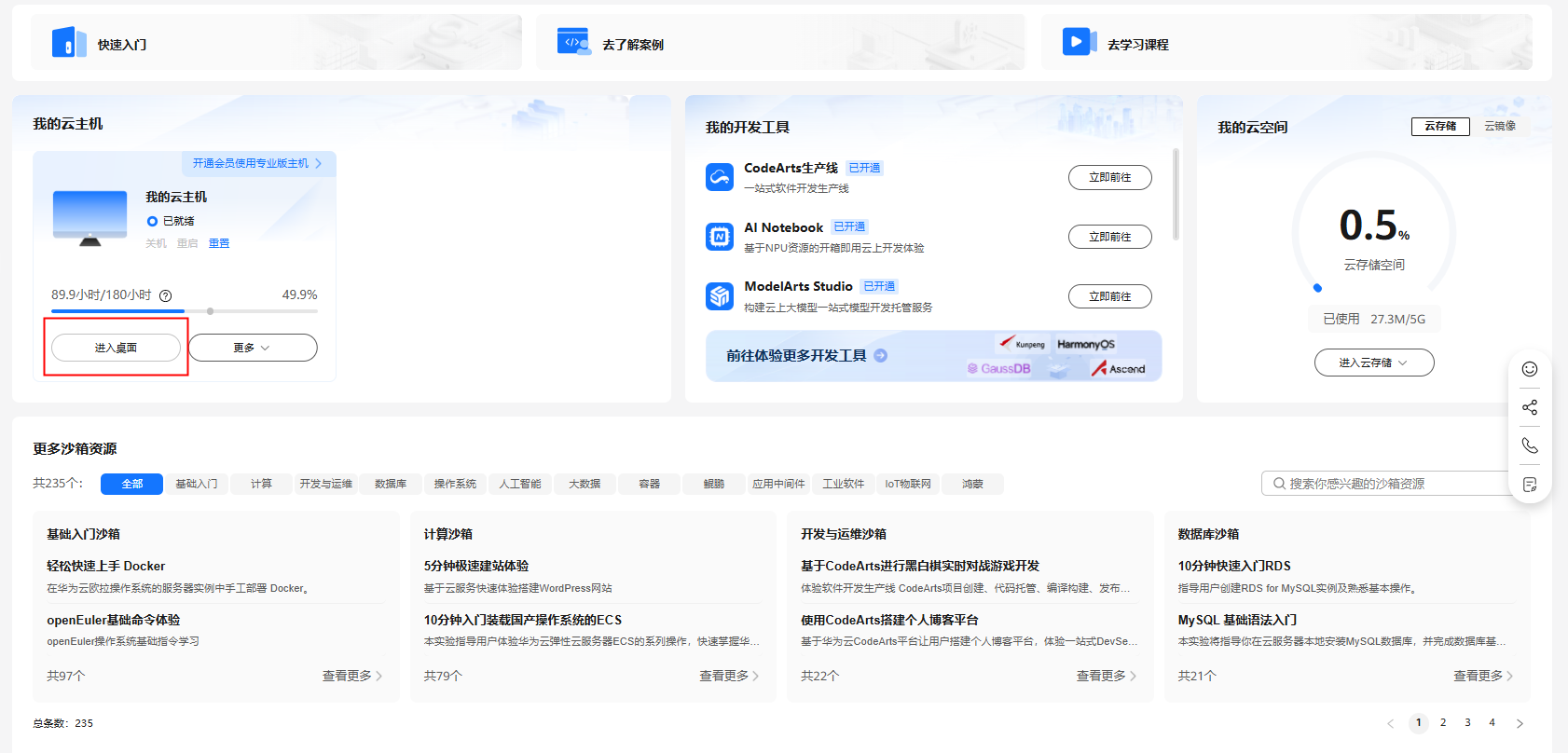 领取云主机后可以直接进入华为开发者空间工作台界面,点击进入桌面连接云主机。