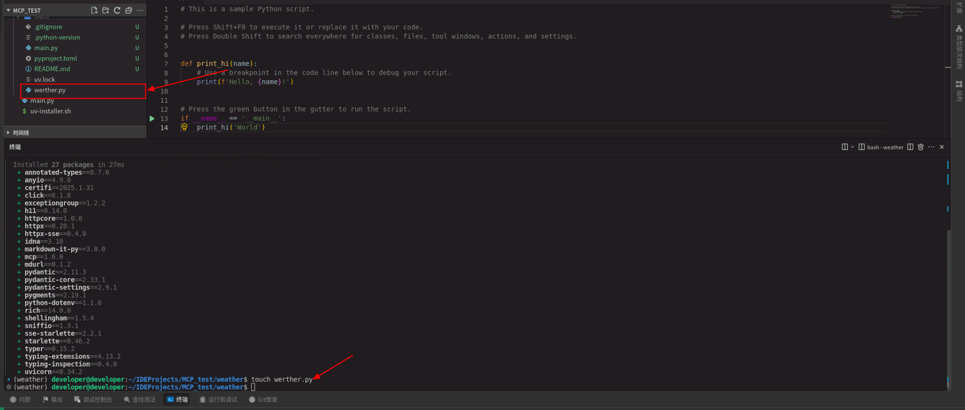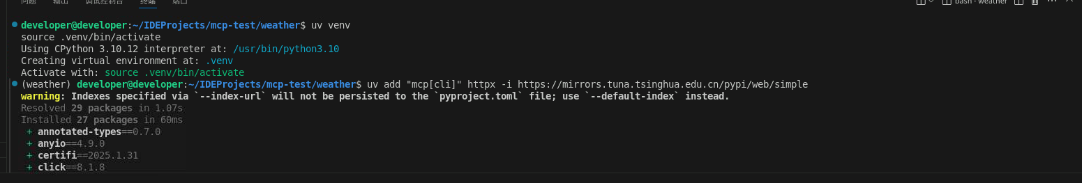 uv add "mcp[cli]" httpx -i https://mirrors.tuna.tsinghua.edu.cn/pypi/web/simple