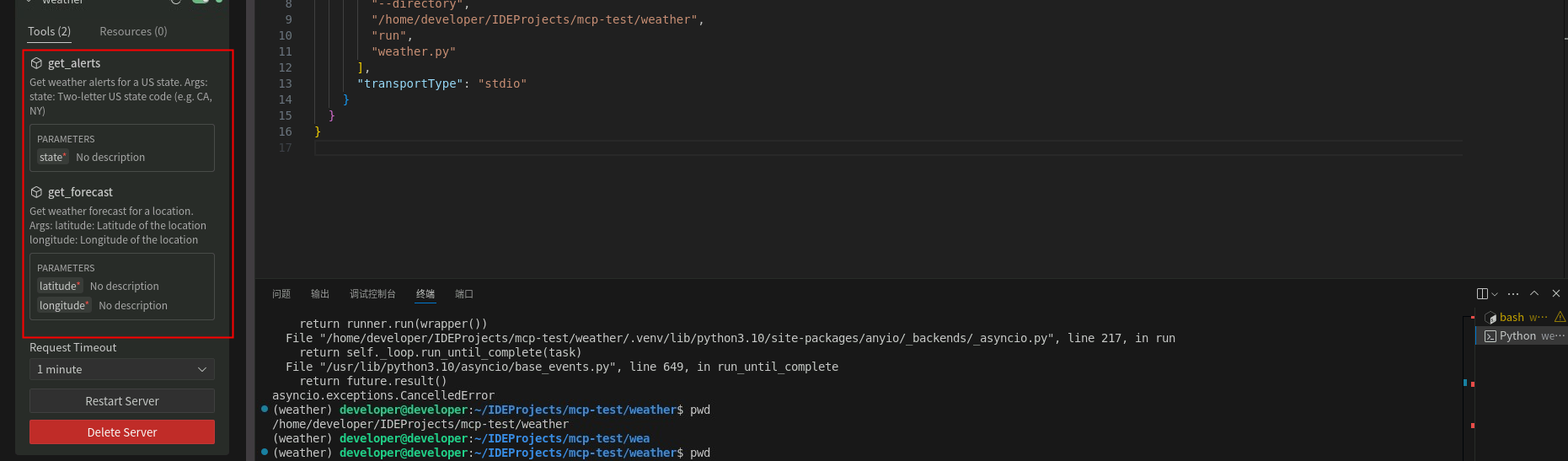 3. 将json文件中的路径参数替换之后ctrl+s进行保存,可以看到,MCP Server提供两个工具,分别为get_alerts和get_forecast,至此MCP Server配置完成。