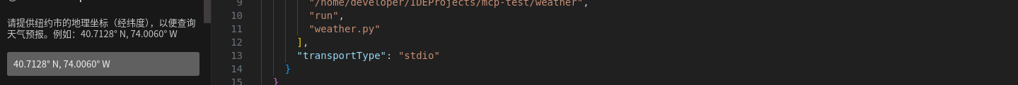 首次提问会询问经纬度坐标,选择默认坐标运行即可。稍等片刻后,返回纽约天气