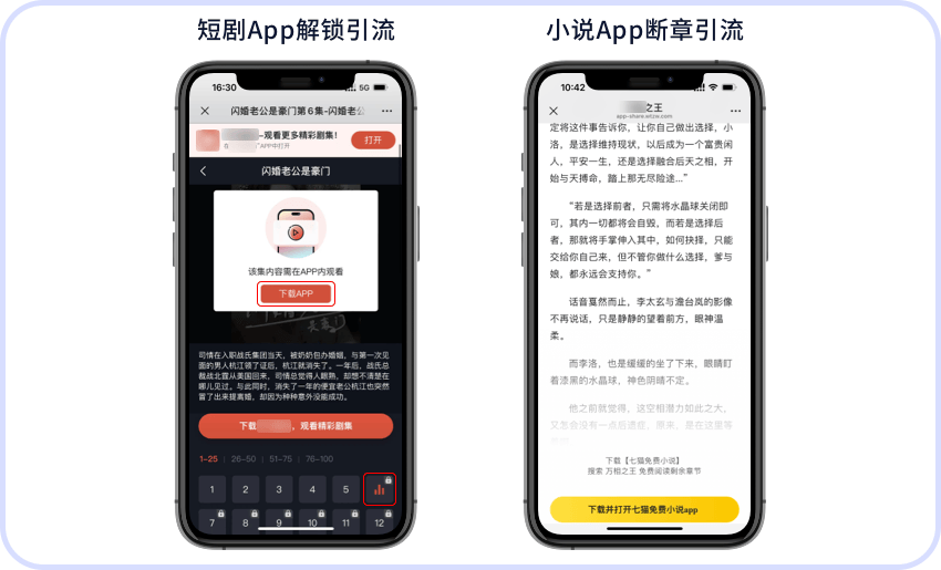 - 短剧/小说等内容App:通过只在页面上展示特定剧集或章节,通过“解锁VIP、断章”等方式吸引用户下载App延续该内容。