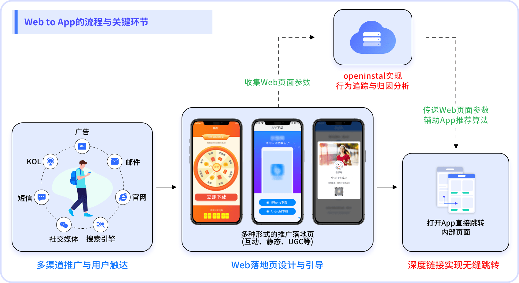 通过Web to App的方式可以在保护隐私的前提下提升追踪效率,利用Web页面优化表单收集第一方数据,并结合openinstall传参归因方案辅助App精准推荐个性化内容: