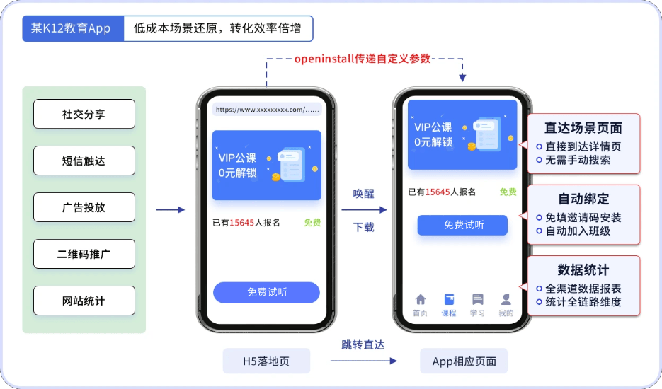 - 用户点击“免费试听”时:已安装用户直达App课程详情页,未安装用户跳转应用商店,安装后自动打开对应课程;