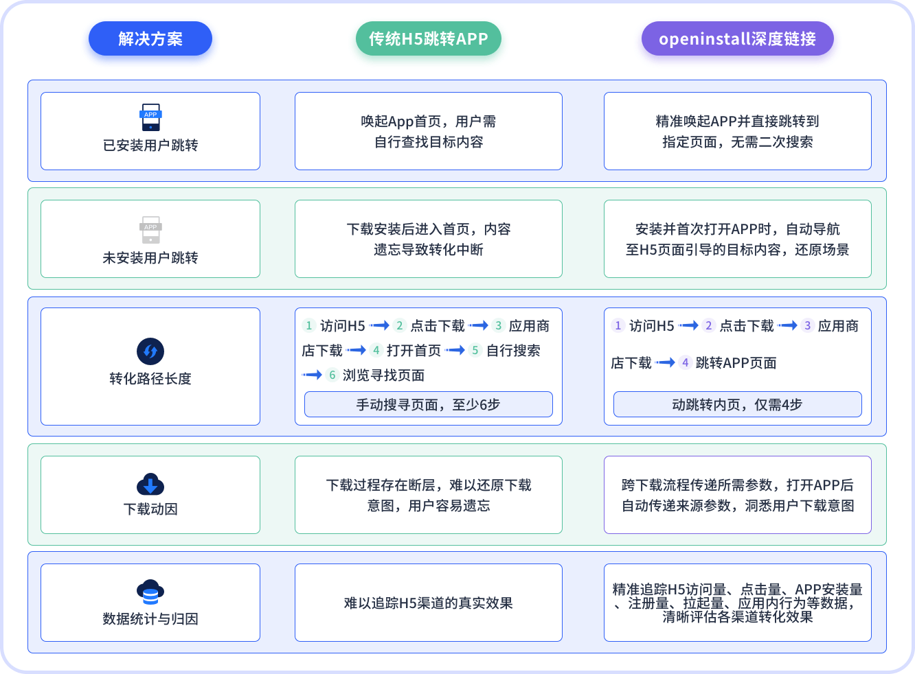 作为专业的深度链接服务商,openinstall针对传统问题提供全面的一键直达+场景还原解决方案,优势一目了然:
