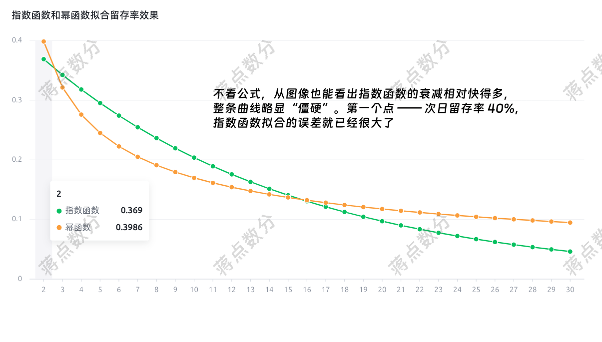 a.我们先定义指数函数和幂函数的 Python 函数,然后使用 curve_fit 来获取参数,scipy 的文档链接,我已经在代码中给出。因为我手里缺乏实际可靠的留存率数据,我们就用 “40-20-10” 来拟合,都说它 Facebook/Meta 给的留存率标准 —— 次日留存 40%,七日留存 20%,30 日留存 10%。