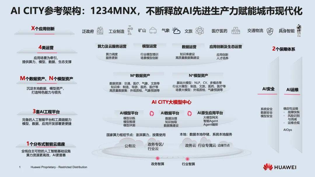 不同于“一城一云一模型”,AI CITY采用了1234MNX的架构:1个分布式智能云底座,AI安全和AI运维构成的2个保障体系,AI模型平台、AI数据平台、AI原生应用平台组成的3套AI工程平台,M个数据资产、N个模型资产,涵盖算力及云服务运营、模型运营、数据运营、应用创新及生态运营的4类运营,以及泛政府、工业制造、矿山、气象、文旅、医疗医药等X个应用创新。