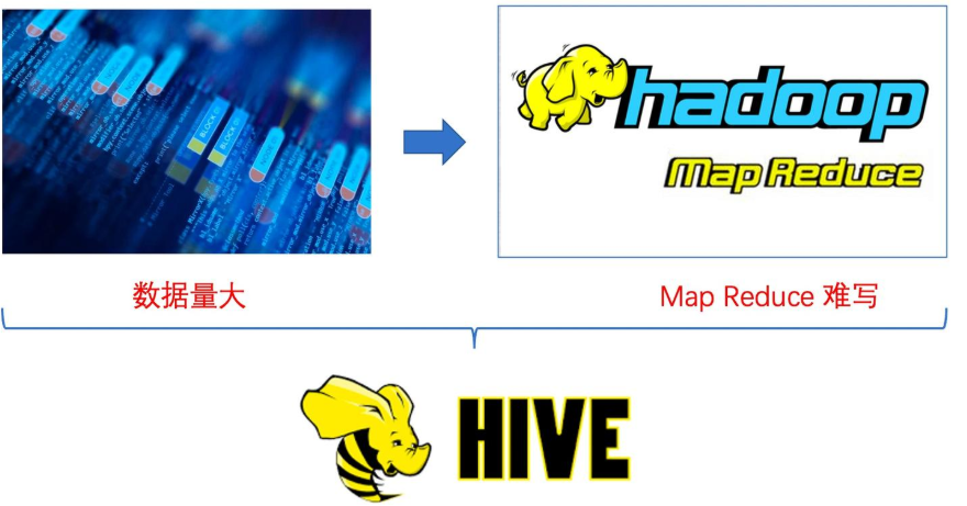 因为传统数仓的不足,大家希望使用上分布式存储,也就是HDFS。然而使用HDFS后发现,基于数据库的数据仓库用SQL就能做查询,现在换到HDFS上面,只能用Mapreduce任务去做分析。给分析代码极大的不便,因此需要一个框架,使用SQL来做HDFS的查询。Hive正是基于类似SQL的语言完成对hdfs数据的查询分析的框架。