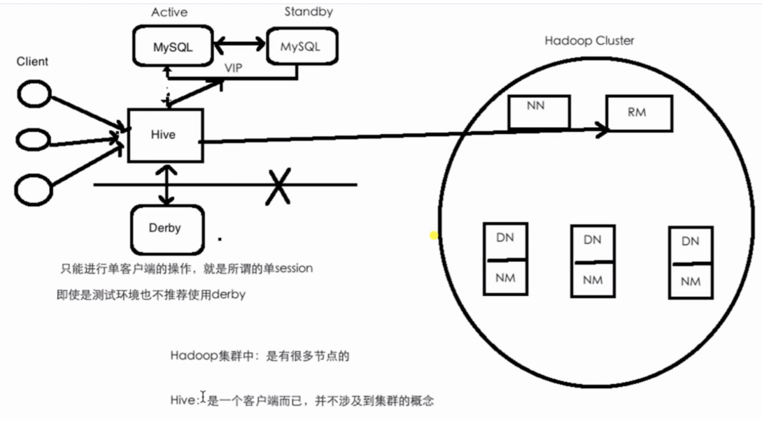 - Metastore: 元数据服务组件。这个组件存储Hive元数据,放在关系型数据库中,支持derby、mysql。