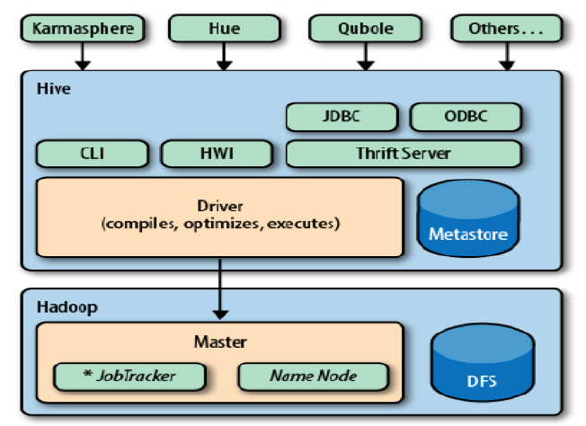 Hive架构包括如下组件:CLI(command line interface)、JDBC/ODBC、Thrift Server、Hive WEB Interface(HWI)、Metastore和Driver(Complier、Optimizer和Executor)