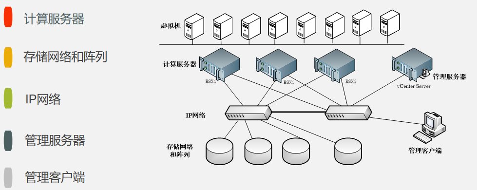 服务器规划 CPU资源 = CPU频率 × CPU数量 × CPU利用率 内存资源 = 内存 × 内存利用率 存储规划 尽量不要使用本地存储,而要采用存储设备(网络存储) 服务器可以考虑配置固态硬盘(SSD)来运行VMware ESXi系统 网络规划 虚拟化架构设计