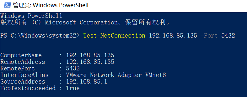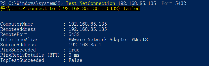 Test-NetConnection 192.168.85.133 -Port 5432