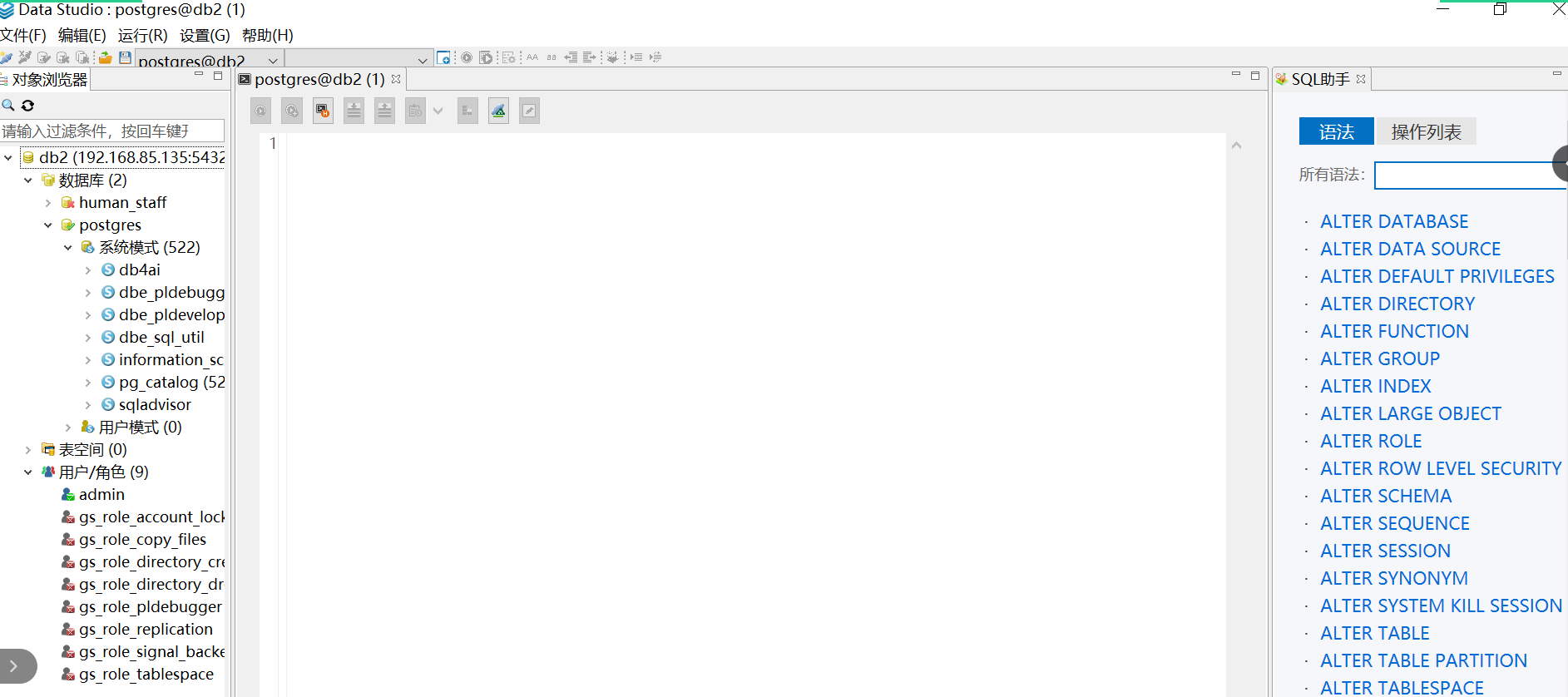 进入到下面的界面表示:Data Studio已经连接openGauss服务器成功!