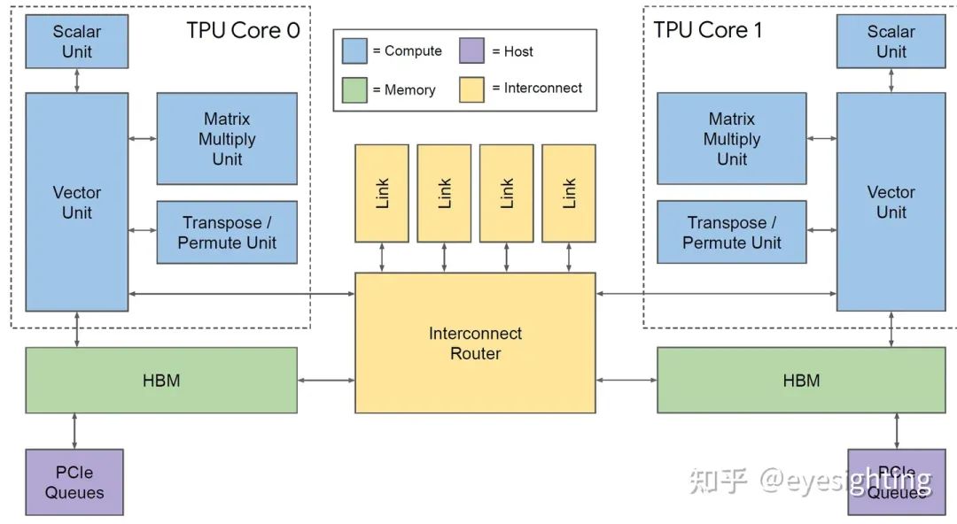 - Host CPU: TPU 通常作为 Host CPU 的协处理器存在。Host CPU 负责加载数据、执行非矩阵运算(如数据预处理、控制逻辑)并将计算任务发送给 TPU。
