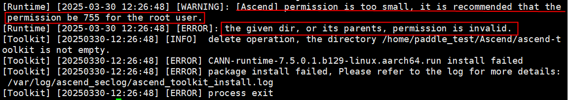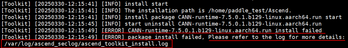 上图中提供了日志文件路径:/var/log/ascend_seclog/ascend_toolkit_install.log,可查看详细日志信息。