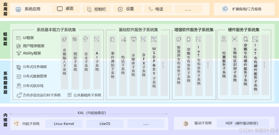- 内核子系统:HarmonyOS采用多内核设计,支持针对不同资源受限设备选用适合的OS内核。内核抽象层(KAL,Kernel Abstract Layer)通过屏蔽多内核差异,对上层提供基础的内核能力,包括进程/线程管理、内存管理、文件系统、网络管理和外设管理等。