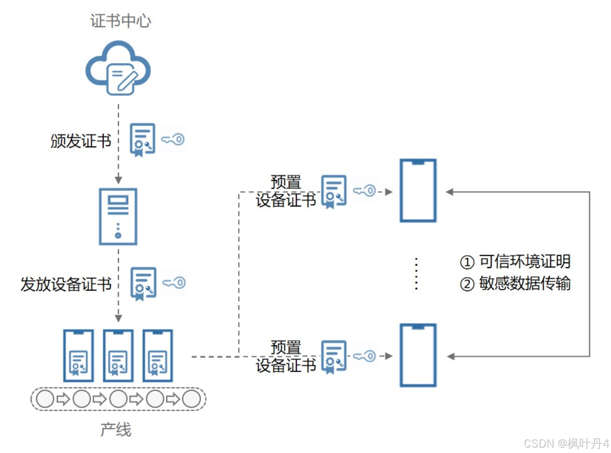 - 设备证书认证:支持为具备可信执行环境的设备预置设备证书,用于向其他虚拟终端证明自己的安全能力。对于有TEE环境的设备,通过预置PKI(Public Key Infrastructure)设备证书给设备身份提供证明,确保设备是合法制造生产的。设备证书在产线进行预置,设备证书的私钥写入并安全保存在设备的TEE环境中,且只在TEE内进行使用。在必须传输用户的敏感数据(例如密钥、加密的生物特征等信息)时,会在使用设备证书进行安全环境验证后,建立从一个设备的TEE到另一设备的TEE之间的安全通道,实现安全传输。
