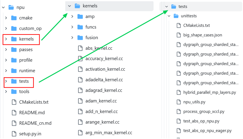 PaddleCustomDevice/backends/npu。在此路径下,有两个目录值得重点关注,分别是 kernels 目录(主要用于算子适配)和 tests 目录(主要用于单元测试)。
