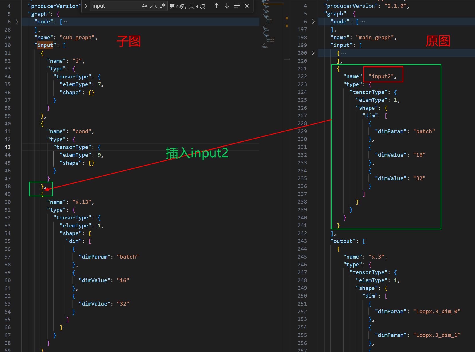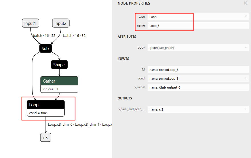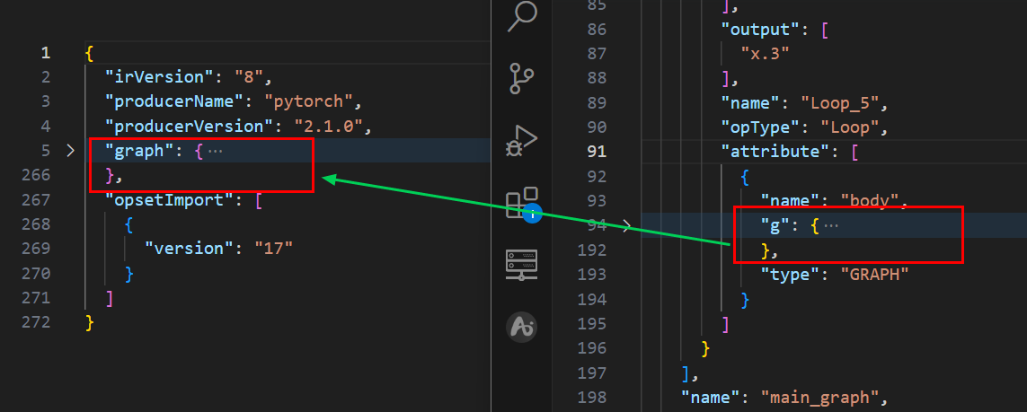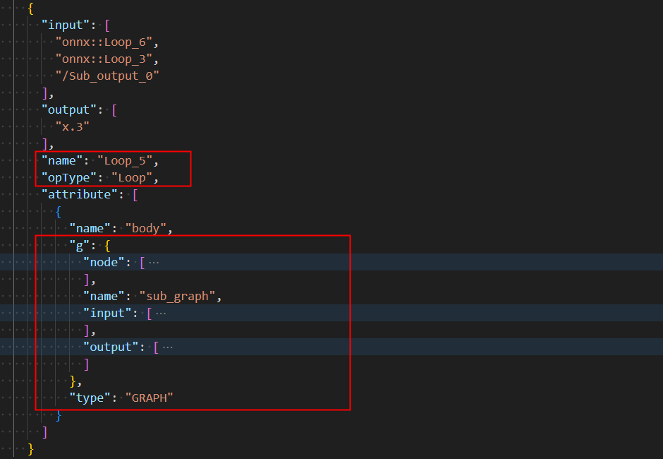 执行结束后生成model.onnx.json文件,打开此文件可以看到,Loop算子包含了一个子图,后续的工作是将子图提取出来