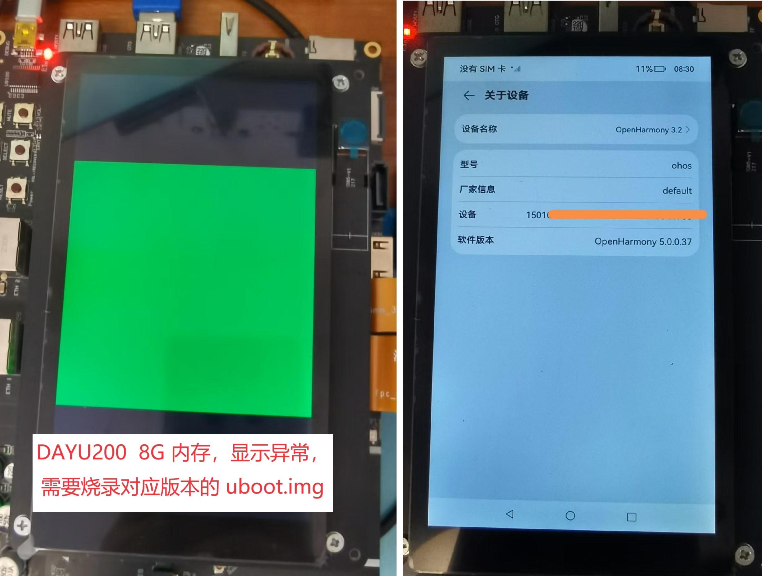 注意,8G内存的Dayu200开发板,烧录默认的 uboot 镜像会有图像异常的情况如下左图所示,单独烧录这里提供的uboot_dayu200_64bit_8G.img uboot镜像之后可正常显示,版本信息如下右图所示。