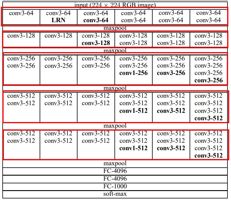 通过对VGG系列整体架构的分析发现,网络差异模块在图中均已用红框标出;从图中分析不难发现差异点在于每一个框内卷积层数不等,但是每一块中卷积层的卷积核与通道数均是相等的。