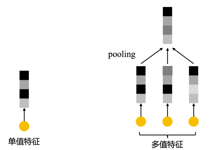 在embedding阶段,所有的离散特征都要被映射成一个固定长度的低维稠密向量。离散特征一般有单值特征和多值特征,分别要做one-hot编码和multi-hot编码,单值特征没什么问题,直接映射成embedding向量即可,而对于多值特征,比如:用户点击过的item序列,用户点击过item类目的序列,通常的操作都是每个item映射成一个embedding向量,然后做一个sum/average pooling,最终得到一个embedding向量。