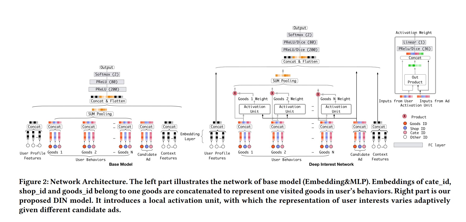 当前广告模型基本上遵循的都是embedding&MLP组合模式(图中basemodel部分),而Din网络通过在embedding层与MLP之间加入Attention机制有效的解决了推荐广告与用户历史购买行为之间相关性的问题,其网络架构重点由两部分组成,一个是激活模块(图中的Activation Unit),另一个是Attention模块(图中的Sumpooling),接下来将分别介绍这两部分的原理及如何使用pytorch搭建这两部分从而构建整个Din网络。