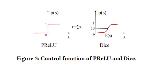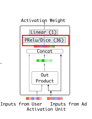 Activation Unit作为Din网络核心模块,通过将用户历史点击过的商品Id(Inputs from User)与候选广告商品的Id(Inputs from Ad)通过Out Product的方式计算相关性。计算相关性后通过concat的方式将原始输入与相关性计算后的输入进行shortcut连接载通过激活与线性层进行输出。关于’PRelu’与’Dice’模块也就是Din网络中引入的自适适应的数据激活函数。