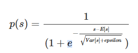 p(s) = \\frac{1}{(1 + e\^{-\\frac{s-E\[s\]}{ \\sqrt{Var\[s\] + epsilon} }})}式中E[s]和Var[s]分别是均值与方差,epsilon是一个常量,默认取值是10^-8。