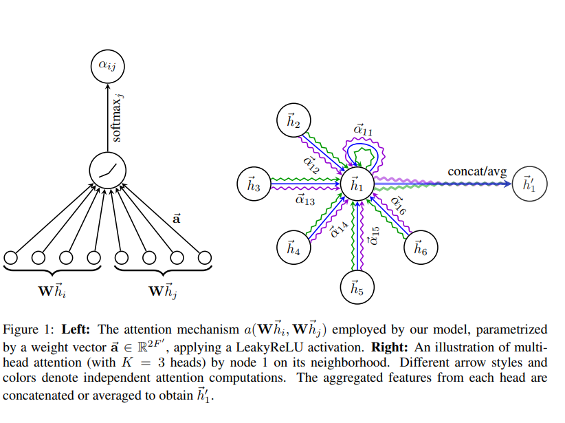 右图表示h_1\^′在邻域中具有多端连接,不同的箭头样式表示独立的注意力计算,通过直连concat或平均avg获取h_1\^′。