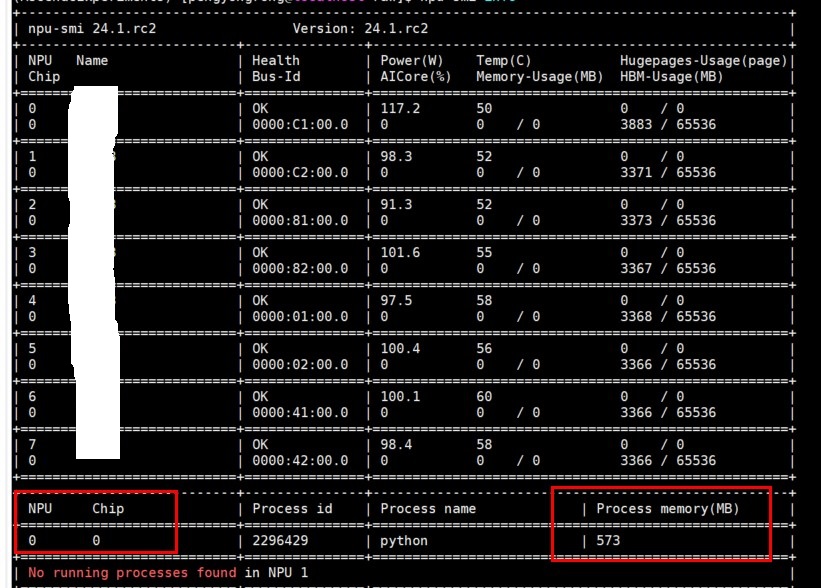 内存使用情况: 整个训练过程的内存使用情况可以通过"npu-smi info"命令在终端查看,因此本文实验只用到了单个npu卡(也就是chip 0),内存占用约573M,对内存、精度或性能优化有兴趣的可以自行尝试进行优化。