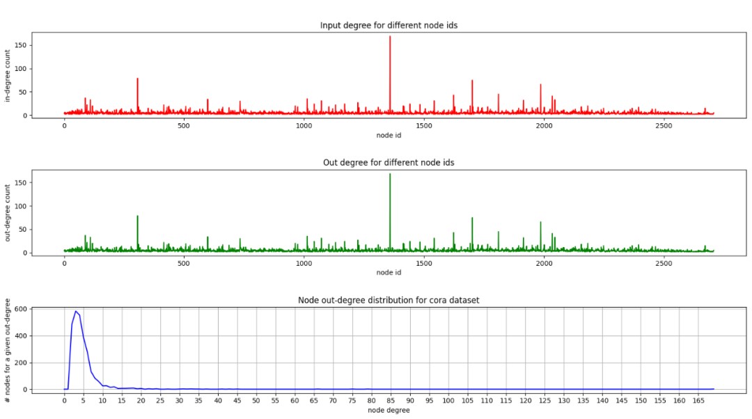 由于cora数据集处理的是无向图,所以’in degree count’与’out degree count’分布图一致,底部的’nodes for a given out-degree’与’node degree’图统计的是数据集中出边的分布情况,可以看到峰值点出现在[2, 4]范围内,说明大多数的节点之间之间与少量的边进行相连,相连节点最多的边是图中绿色节点,约有169个节点相连。