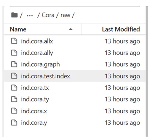 下载后的数据集总共包含8个文件分别是ind.cora.x、ind.cora.tx、ind.cora.all、ind.cora.y、ind.cora.ty、ind.cora.ally、ind.cora.graph与ind.cora.test.index。