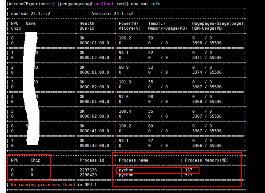 内存使用情况: 整个训练过程的内存使用情况可以通过"npu-smi info"命令在终端查看,因此本文实验只用到了单个npu卡(也就是chip 0),内存占用约167M,对内存、精度或性能优化有兴趣的可以自行尝试进行优化,这里运行过程中也有其他程序在运行,因此本实验用到的网络所需要的内存已单独框出来。