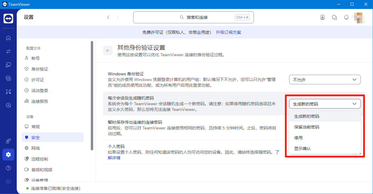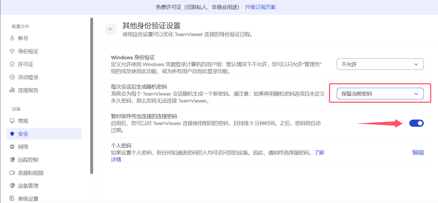 而其他身份设置这一块,可关联 Windows 身份使用。另外它的随机密码和国内软件的临时密码相似,但密码更新设置可以选择停用或保留当前,可以看出更新频率是很低的,密码被分享的风险极大,除非自用。但是TeamViewer 下面又提供了一个暂时保存传出连接的连接密码,开启后密码可持续5分钟,之后自动过期,这2个相悖的功能放在一起会不会冲突?