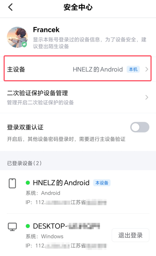 下面是开启“二次验证保护”具体操作步骤,在【高级设置】-【安全设置】中勾选“二次验证保护”,需要等待主设备同意确认,才能开启。