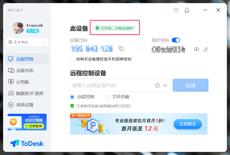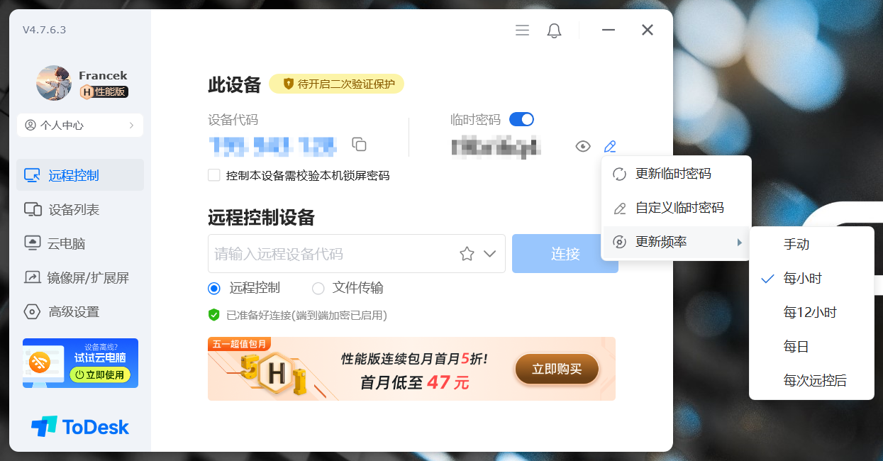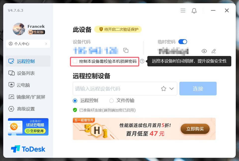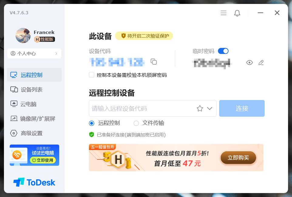 这是我已经开通的 ToDesk 性能版,主界面如下: