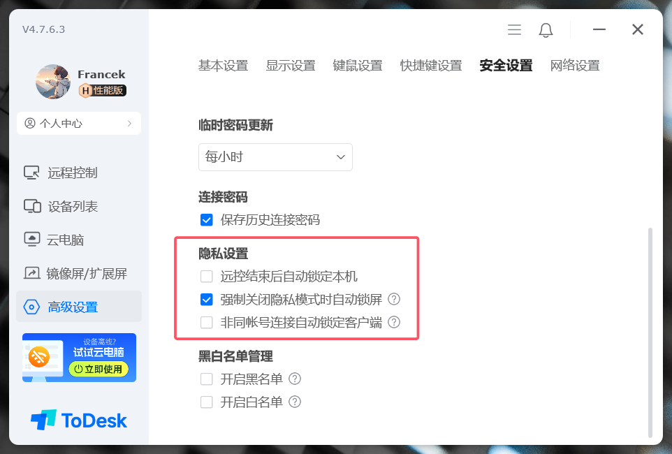 这一方面ToDesk 分配范围较少,主要集中在对本机的连接保护,对远程内容并无过多干涉。